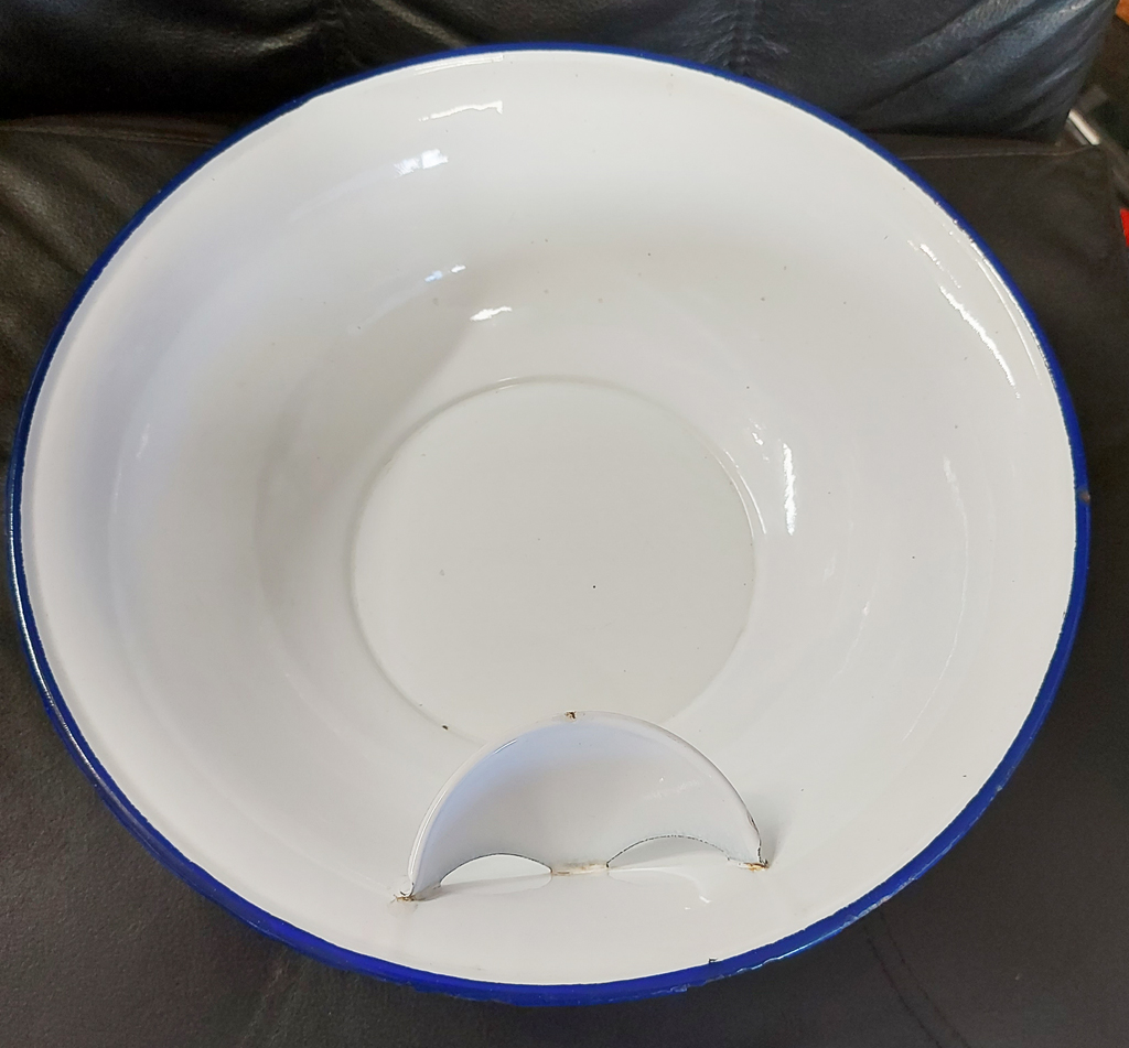 <li>Alte Waschschüssel mit Seifenablage innen und Aufhänger aussen vorne (Ring beweglich)</li>